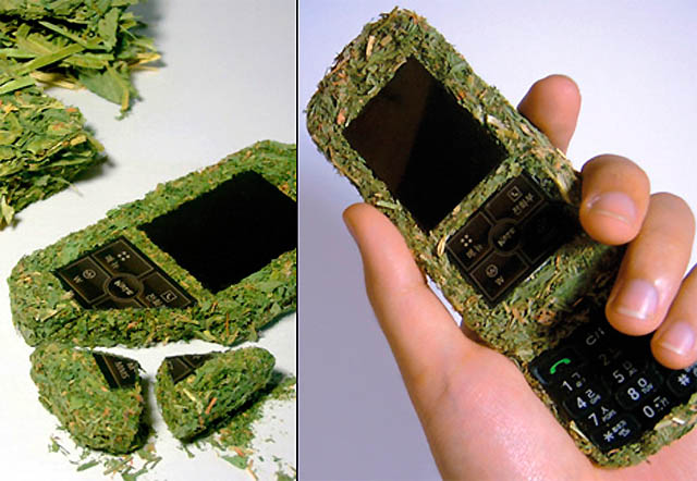 This is the first "green" cell phone I have seen. By looking at it, one can see that it is very green colored, grasslike in fact, and I am unsure that it actually is made out of anything other than grass. While some people may be attracted to the "green" movement, but in this case, the problem may not be as much with the actual phone as with the person who designed the photo. Who really wants to see a phone broken? Is that a good idea? It looks more like horse-feed than anything useful. A real life, "green" cell phone would be a big hit though.